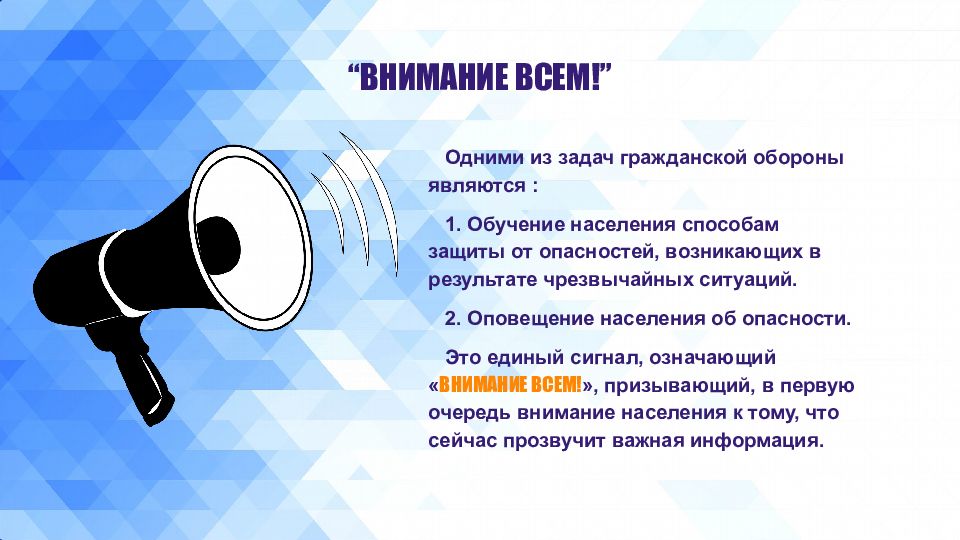 Одними из задач гражданской обороны являются : 1. Обучение населения способам защиты от опасностей, возникающих в результате чрезвычайных ситуаций. 2. Оповещение населения об опасности. Это единый сигнал, означающий « ВНИМАНИЕ ВСЕМ! », призывающий, в первую очередь внимание населения к тому, что сейчас прозвучит важная информация.