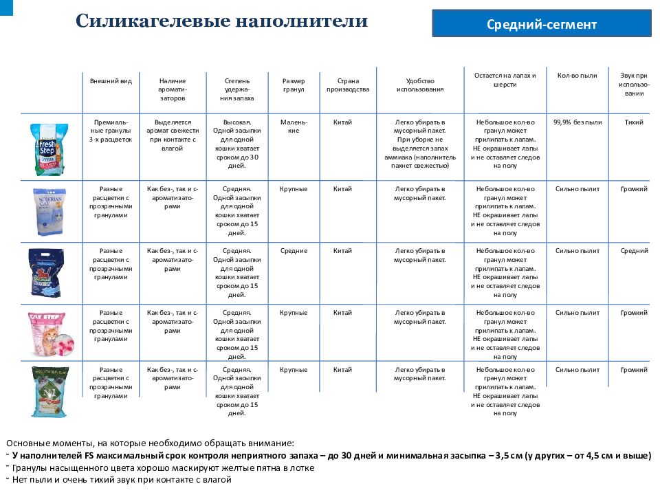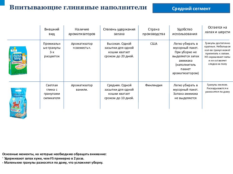 Средний сегмент Впитывающие глиняные наполнители Наличие ароматизаторов Степень удержания запаха Страна производства Внешний вид Премиальные гранулы 3-х расцветок Светлая глина с гранулами силикагеля Ароматизатор «свежесть». Ароматизатор ванили. Высокая. Одной засыпки для одной кошки хватает сроком до 20 дней. США Средняя. Одной засыпки для одной кошки хватает сроком до 10 дней. Удобство использования Легко убирать в мусорный пакет. При уборке не выделяется запах аммиака (наполнитель пахнет ароматизатором) Легко убирать в мусорный пакет. Запаха аммиака не выделяется Остается на лапах и шерсти Финляндия Основные моменты, на которые необходимо обращать внимание: Удерживают запах хуже, чем FS примерно в 2 раза. - Маленькие гранулы разносятся по дому, что усложняет уборку. Гранулы достаточно крупные. Небольшое кол-во гранул может прилипать к лапам. НЕ окрашивает лапы и не оставляет следов на полу Гранулы мелкие. Раскидываются и разносятся по дому