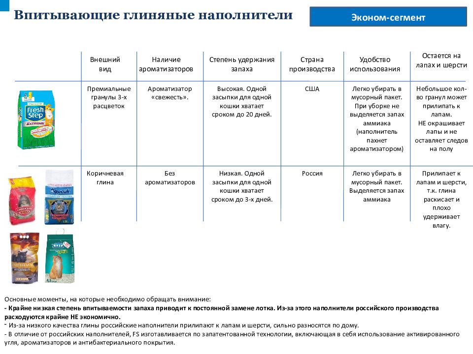 Эконом-сегмент Впитывающие глиняные наполнители Наличие ароматизаторов Степень удержания запаха Страна производства Внешний вид Премиальные гранулы 3-х расцветок Коричневая глина Ароматизатор «свежесть». Без ароматизаторов Высокая. Одной засыпки для одной кошки хватает сроком до 20 дней. США Низкая. Одной засыпки для одной кошки хватает сроком до 3-х дней. Удобство использования Легко убирать в мусорный пакет. При уборке не выделяется запах аммиака (наполнитель пахнет ароматизатором) Легко убирать в мусорный пакет. Выделяется запах аммиака Остается на лапах и шерсти Небольшое кол-во гранул может прилипать к лапам. НЕ окрашивает лапы и не оставляет следов на полу Прилипает к лапам и шерсти, т.к. глина раскисает и плохо удерживает влагу. Основные моменты, на которые необходимо обращать внимание: - Крайне низкая степень впитываемости запаха приводит к постоянной замене лотка. Из-за этого наполнители российского производства расходуются крайне НЕ экономично. Из-за низкого качества глины российские наполнители прилипают к лапам и шерсти, сильно разносятся по дому. - В отличие от российских наполнителей, FS изготавливается по запатентованной технологии, включающая в себя использование активированного угля, ароматизаторов и антибактериального покрытия. Россия