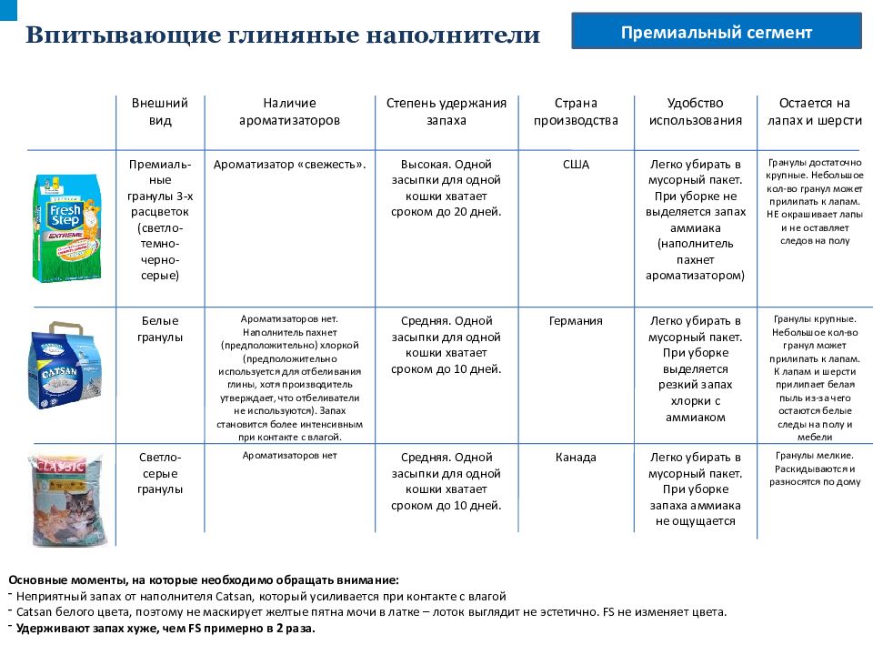Премиальный сегмент Впитывающие глиняные наполнители Наличие ароматизаторов Степень удержания запаха Страна производства Внешний вид Премиаль - ные гранулы 3-х расцветок (светло-темно-черно-серые) Белые гранулы Ароматизатор «свежесть». Ароматизаторов нет. Наполнитель пахнет (предположительно) хлоркой (предположительно используется для отбеливания глины, хотя производитель утверждает, что отбеливатели не используются). Запах становится более интенсивным при контакте с влагой. Высокая. Одной засыпки для одной кошки хватает сроком до 20 дней. США Средняя. Одной засыпки для одной кошки хватает сроком до 10 дней. Удобство использования Легко убирать в мусорный пакет. При уборке не выделяется запах аммиака (наполнитель пахнет ароматизатором) Легко убирать в мусорный пакет. При уборке выделяется резкий запах хлорки с аммиаком Остается на лапах и шерсти Гранулы достаточно крупные. Небольшое кол-во гранул может прилипать к лапам. НЕ окрашивает лапы и не оставляет следов на полу Гранулы крупные. Небольшое кол-во гранул может прилипать к лапам. К лапам и шерсти прилипает белая пыль из-за чего остаются белые следы на полу и мебели Германия Основные моменты, на которые необходимо обращать внимание: Неприятный запах от наполнителя Catsan, который усиливается при контакте с влагой Catsan белого цвета, поэтому не маскирует желтые пятна мочи в латке – лоток выглядит не эстетично. FS не изменяет цвета. Удерживают запах хуже, чем FS примерно в 2 раза. Светло-серые гранулы Канада Легко убирать в мусорный пакет. При уборке запаха аммиака не ощущается Средняя. Одной засыпки для одной кошки хватает сроком до 10 дней. Гранулы мелкие. Раскидываются и разносятся по дому Ароматизаторов нет
