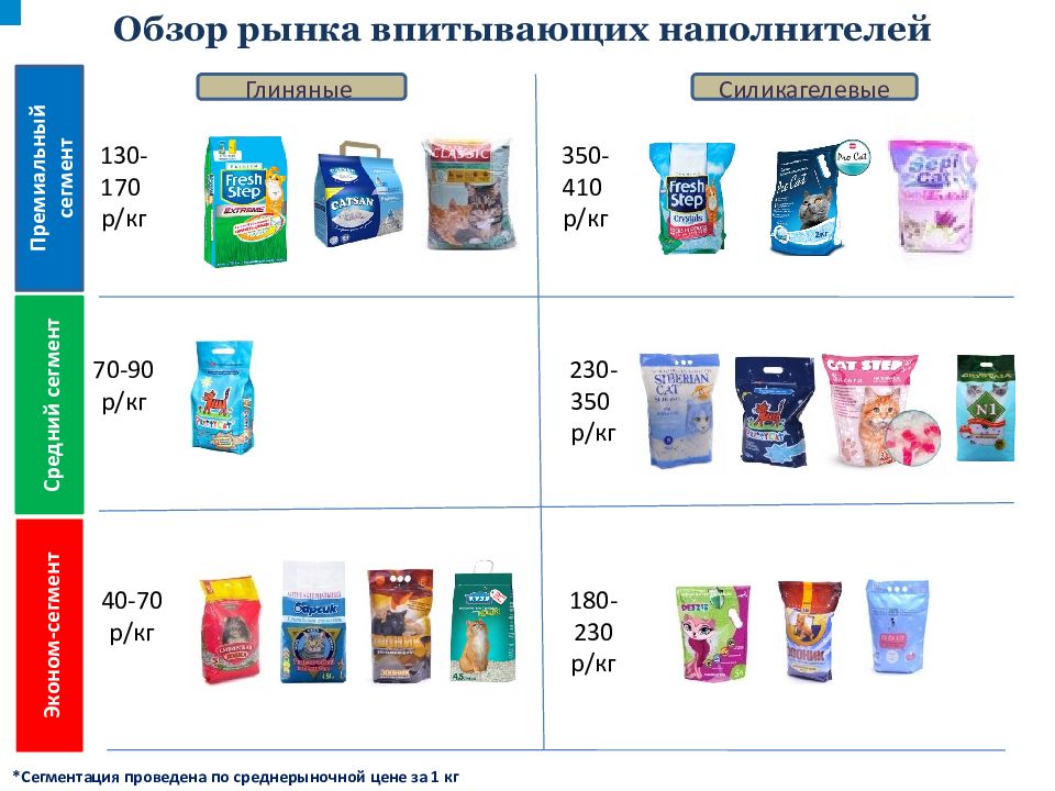Премиальный сегмент Эконом-сегмент Средний сегмент Обзор рынка впитывающих наполнителей *Сегментация проведена по среднерыночной цене за 1 кг 130-170 р /кг 70-90 р /кг 40-70 р /кг Глиняные Силикагелевые 350-410 р /кг 230-350 р /кг 180-230 р /кг