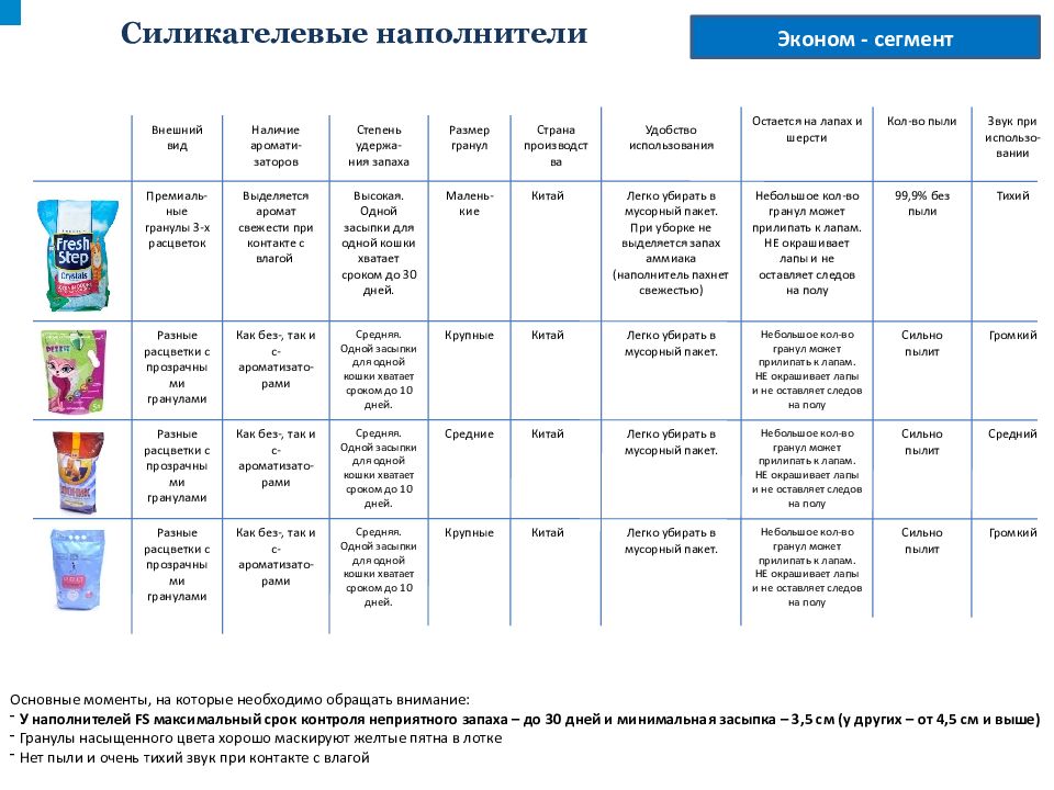 Эконом - сегмент Силикагелевые наполнители Основные моменты, на которые необходимо обращать внимание: У наполнителей FS максимальный срок контроля неприятного запаха – до 30 дней и минимальная засыпка – 3,5 см (у других – от 4,5 см и выше) Гранулы насыщенного цвета хорошо маскируют желтые пятна в лотке Нет пыли и очень тихий звук при контакте с влагой Наличие аромати - заторов Степень удержа - ния запаха Страна производства Внешний вид Премиаль - ные гранулы 3-х расцветок Выделяется аромат свежести при контакте с влагой Высокая. Одной засыпки для одной кошки хватает сроком до 30 дней. Китай Удобство использования Легко убирать в мусорный пакет. При уборке не выделяется запах аммиака (наполнитель пахнет свежестью) Остается на лапах и шерсти Небольшое кол-во гранул может прилипать к лапам. НЕ окрашивает лапы и не оставляет следов на полу Кол-во пыли Звук при использо - вании 99,9% без пыли Тихий Разные расцветки с прозрачными гранулами Как без-, так и с- ароматизато - рами Средняя. Одной засыпки для одной кошки хватает сроком до 10 дней. Китай Китай Китай Легко убирать в мусорный пакет. Размер гранул Малень - кие Крупные Средние Крупные Средняя. Одной засыпки для одной кошки хватает сроком до 10 дней. Средняя. Одной засыпки для одной кошки хватает сроком до 10 дней. Громкий Средний Громкий Сильно пылит Сильно пылит Сильно пылит Небольшое кол-во гранул может прилипать к лапам. НЕ окрашивает лапы и не оставляет следов на полу Небольшое кол-во гранул может прилипать к лапам. НЕ окрашивает лапы и не оставляет следов на полу Небольшое кол-во гранул может прилипать к лапам. НЕ окрашивает лапы и не оставляет следов на полу Легко убирать в мусорный пакет. Легко убирать в мусорный пакет. Разные расцветки с прозрачными гранулами Как без-, так и с- ароматизато - рами Разные расцветки с прозрачными гранулами Как без-, так и с- ароматизато - рами
