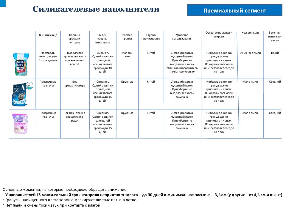 Премиальный сегмент Силикагелевые наполнители Основные моменты, на которые необходимо обращать внимание: У наполнителей FS максимальный срок контроля неприятного запаха – до 30 дней и минимальная засыпка – 3,5 см (у других – от 4,5 см и выше) Гранулы насыщенного цвета хорошо маскируют желтые пятна в лотке Нет пыли и очень тихий звук при контакте с влагой Наличие аромати - заторов Степень удержа - ния запаха Страна производства Внешний вид Удобство использования Остается на лапах и шерсти Кол-во пыли Звук при использо - вании Размер гранул Премиаль - ные гранулы 3-х расцветок Выделяется аромат свежести при контакте с влагой Высокая. Одной засыпки для одной кошки хватает сроком до 30 дней. Китай Легко убирать в мусорный пакет. При уборке не выделяется запах аммиака (наполнитель пахнет свежестью) Небольшое кол-во гранул может прилипать к лапам. НЕ окрашивает лапы и не оставляет следов на полу 99,9% без пыли Тихий Малень - кие Прозрачные гранулы Без ароматизатора Средняя. Одной засыпки для одной кошки хватает сроком до 15 дней. Крупные Китай Китай Легко убирать в мусорный пакет. При уборке не выделяется запах аммиака Легко убирать в мусорный пакет. При уборке не выделяется запах аммиака Небольшое кол-во гранул может прилипать к лапам. НЕ окрашивает лапы и не оставляет следов на полу Небольшое кол-во гранул может прилипать к лапам. НЕ окрашивает лапы и не оставляет следов на полу Мало пыли Мало пыли Средний Средний Крупные Средняя. Одной засыпки для одной кошки хватает сроком до 15 дней. Прозрачные гранулы Как без-, так и с- ароматизато - рами