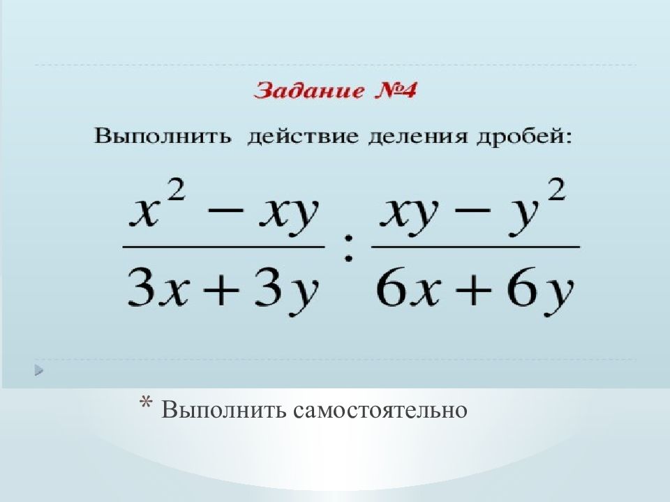 Решение: Сначала упростим выражение – разложим и числитель и знаменатель на множители * = В числителе и знаменателе получили одинаковый множитель ( x-2y). Сократим Числовой множитель, как правило, ставят на первое место, поэтому