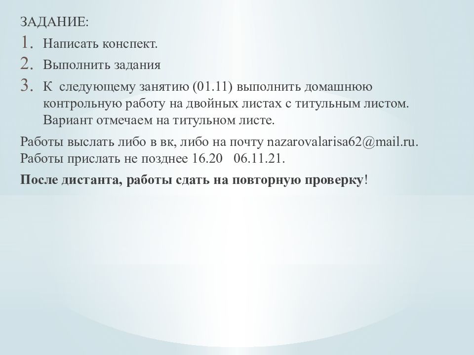 ЗАДАНИЕ: Написать конспект. Выполнить задания К следующему занятию (01.11) выполнить домашнюю контрольную работу на двойных листах с титульным листом. Вариант отмечаем на титульном листе. Работы выслать либо в вк, либо на почту nazarovalarisa62@mail.ru. Работы прислать не позднее 16.20 06.11.21. После дистанта, работы сдать на повторную проверку !