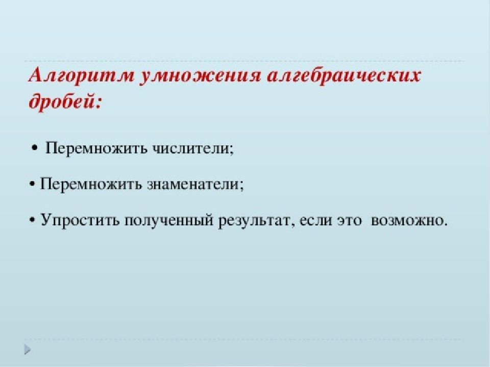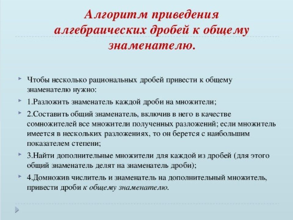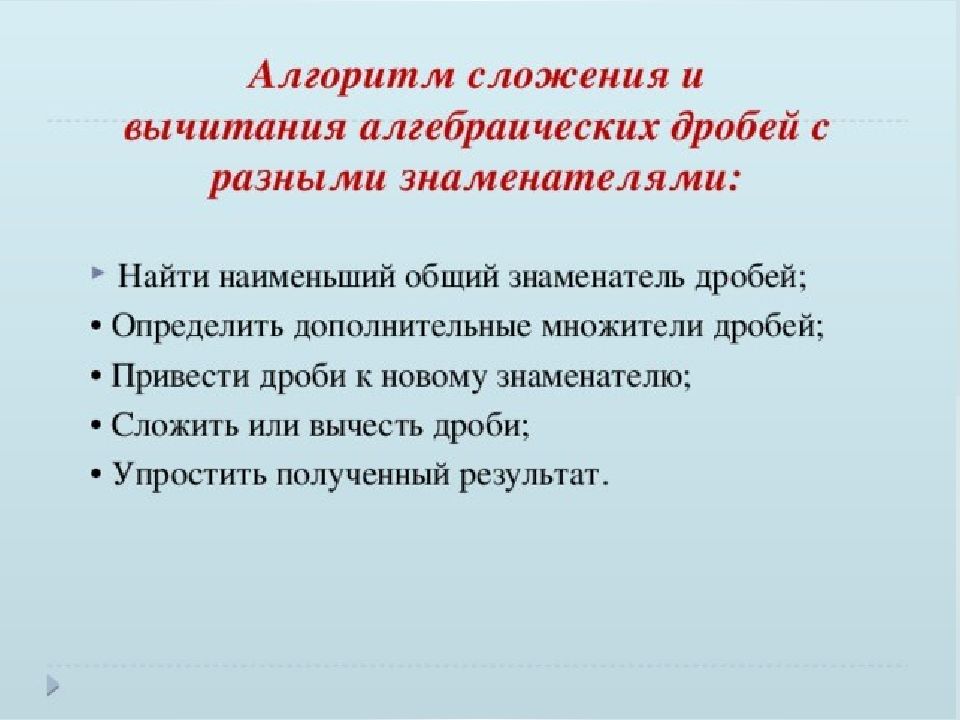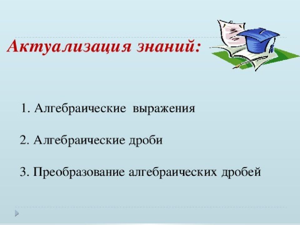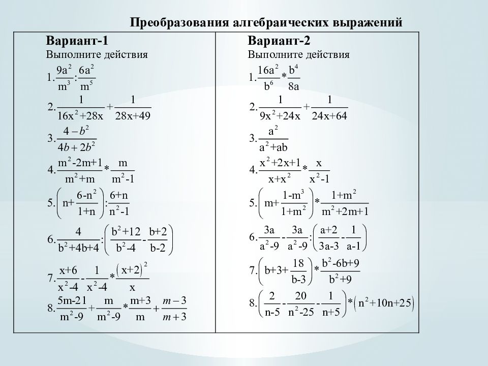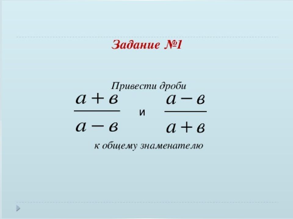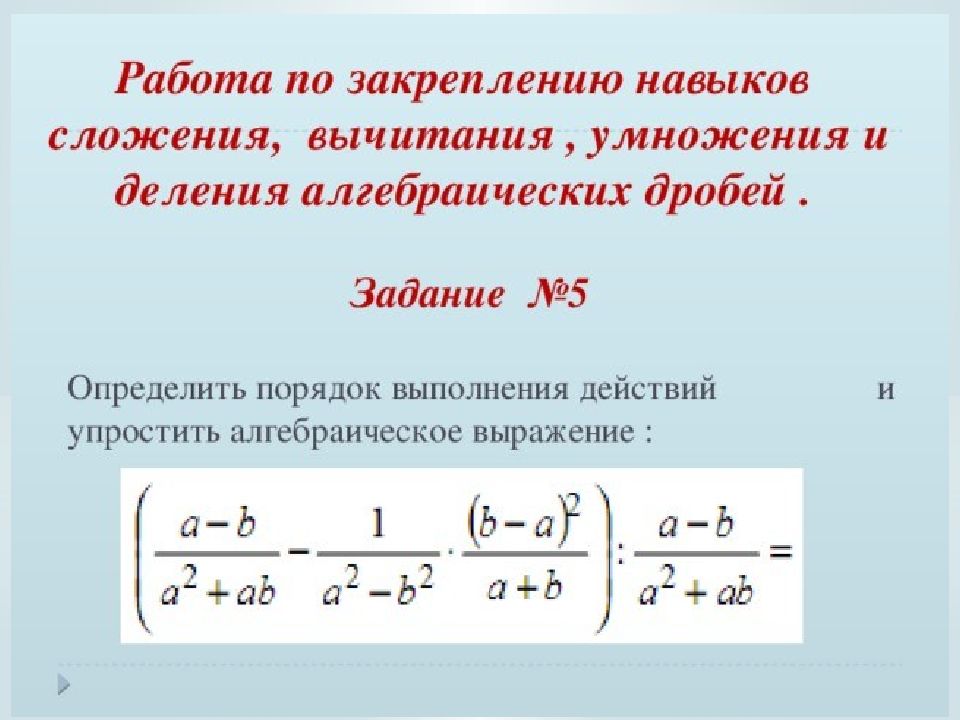 Первый слайд презентации: ПРЕОБРАЗОВАНИЕ АЛГЕБРАИЧЕСКИХ ДРОБЕЙ