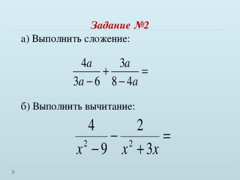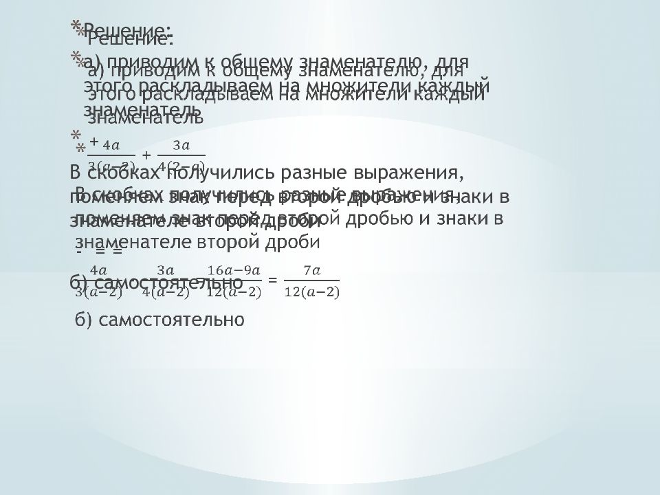 Решение: а) приводим к общему знаменателю, для этого раскладываем на множители каждый знаменатель + В скобках получились разные выражения, поменяем знак перед второй дробью и знаки в знаменателе второй дроби - = = б) самостоятельно