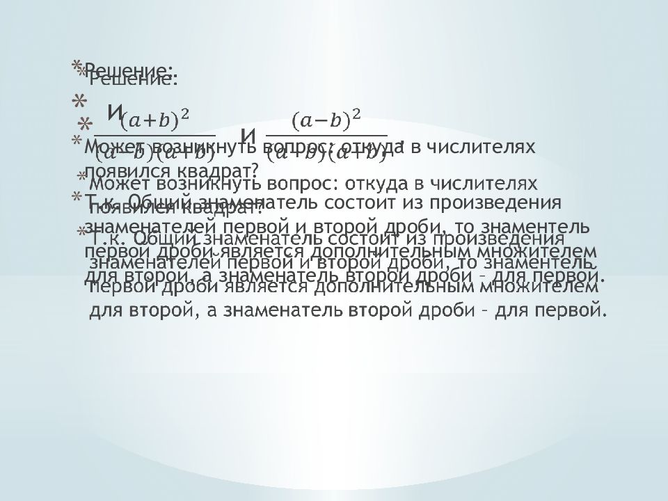 Решение: и Может возникнуть вопрос: откуда в числителях появился квадрат? Т.к. Общий знаменатель состоит из произведения знаменателей первой и второй дроби, то знаментель первой дроби является дополнительным множителем для второй, а знаменатель второй дроби – для первой.