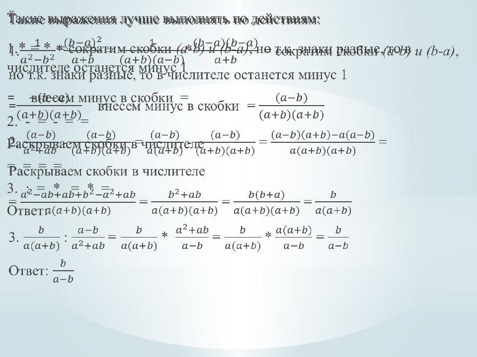 Такие выражения лучше выполнять по действиям: 1. * = * = сократим скобки (a-b) и (b-a), но т.к. знаки разные, то в числителе останется минус 1 = внесем минус в скобки = 2. - = - = = Раскрываем скобки в числителе = = = = 3. : = * = * = Ответ: