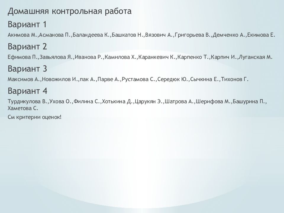 Домашняя контрольная работа Вариант 1 Акимова М.,Асманова П.,Баландеева К.,Башкатов Н.,Вязович А.,Григорьева В.,Демченко А.,Екимова Е. Вариант 2 Ефимова П.,Завьялова Я.,Иванова Р.,Камилова Х.,Каранкевич К.,Карпенко Т.,Карпич И.,Луганская М. Вариант 3 Максимов А.,Новожилов И.,пак А.,Парве А.,Рустамова С.,Середюк Ю.,Сычкина Е.,Тихонов Г. Вариант 4 Турдикулова В.,Ухова О.,Филина С.,Хотькина Д.,Царукян Э.,Шатрова А.,Шерифова М.,Башурина П., Хаметова С. См критерии оценок!