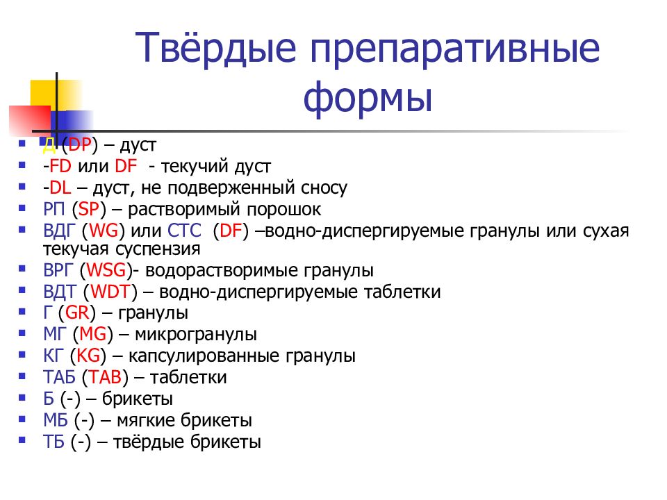 Д ( DP ) – дуст - FD или DF - текучий дуст - DL – дуст, не подверженный сносу РП ( SP ) – растворимый порошок ВДГ ( WG ) или СТС ( DF ) – водно-диспергируемые гранулы или сухая текучая суспензия ВРГ ( WSG ) - водорастворимые гранулы ВДТ ( WDT ) – водно-диспергируемые таблетки Г ( GR ) – гранулы МГ ( MG ) – микрогранулы КГ ( KG ) – капсулированные гранулы ТАБ ( TAB ) – таблетки Б (-) – брикеты МБ (-) – мягкие брикеты ТБ (-) – твёрдые брикеты