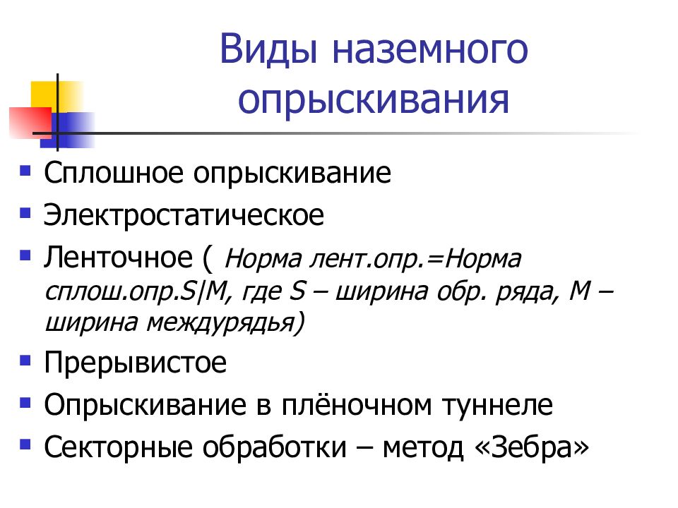 Сплошное опрыскивание Электростатическое Ленточное ( Норма лент.опр.=Норма сплош.опр. S|M, где S – ширина обр. ряда, М – ширина междурядья) Прерывистое Опрыскивание в плёночном туннеле Секторные обработки – метод «Зебра»