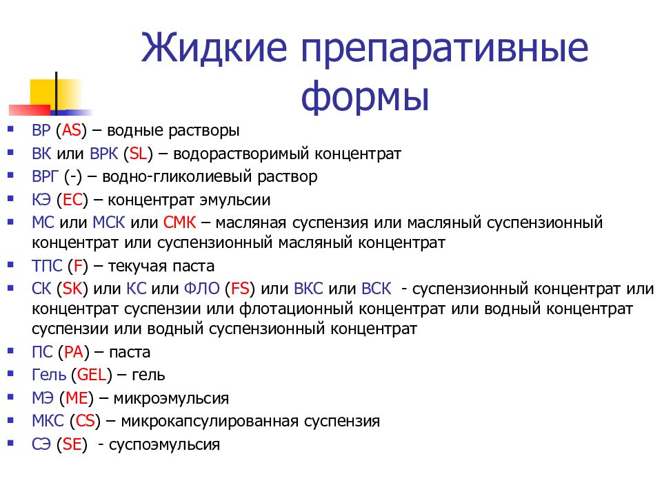 ВР ( AS ) – водные растворы ВК или ВРК ( SL ) – водорастворимый концентрат ВРГ (-) – водно-гликолиевый раствор КЭ ( EC ) – концентрат эмульсии МС или МСК или СМК – масляная суспензия или масляный суспензионный концентрат или суспензионный масляный концентрат ТПС ( F ) – текучая паста СК ( SK ) или КС или ФЛО ( FS ) или ВКС или ВСК - суспензионный концентрат или концентрат суспензии или флотационный концентрат или водный концентрат суспензии или водный суспензионный концентрат ПС ( PA ) – паста Гель ( GEL ) – гель МЭ ( ME ) – микроэмульсия МКС ( CS ) – микрокапсулированная суспензия СЭ ( SE ) - суспоэмульсия