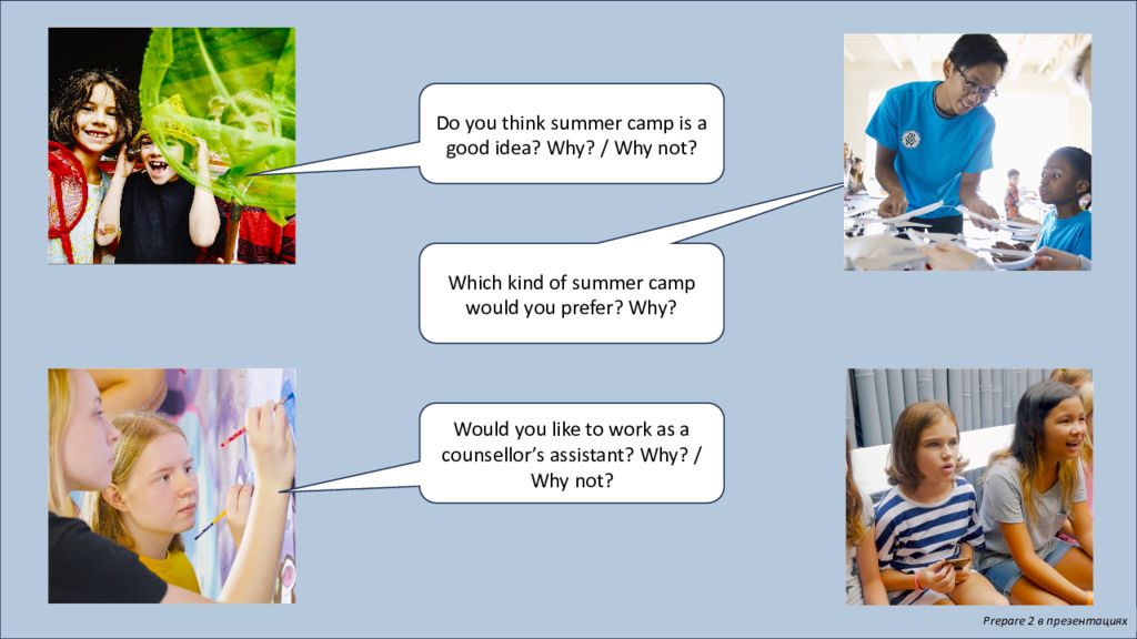Prepare 2 в презентациях Which kind of summer camp would you prefer? Why? Would you like to work as a counsellor’s assistant? Why? / Why not? Do you think summer camp is a good idea? Why? / Why not?