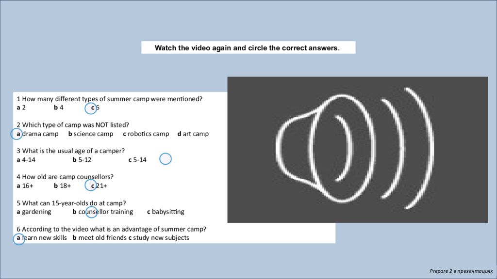 Prepare 2 в презентациях 1 How many different types of summer camp were mentioned? a 2 b 4 c 6 2 Which type of camp was NOT listed? a drama camp b science camp c robotics camp d art camp 3 What is the usual age of a camper? a 4-14 b 5-12 c 5-14 4 How old are camp counsellors? a 16+ b 18+ c 21+ 5 What can 15-year-olds do at camp? a gardening b counsellor training c babysitting 6 According to the video what is an advantage of summer camp? a learn new skills b meet old friends c study new subjects Watch the video again and circle the correct answers.