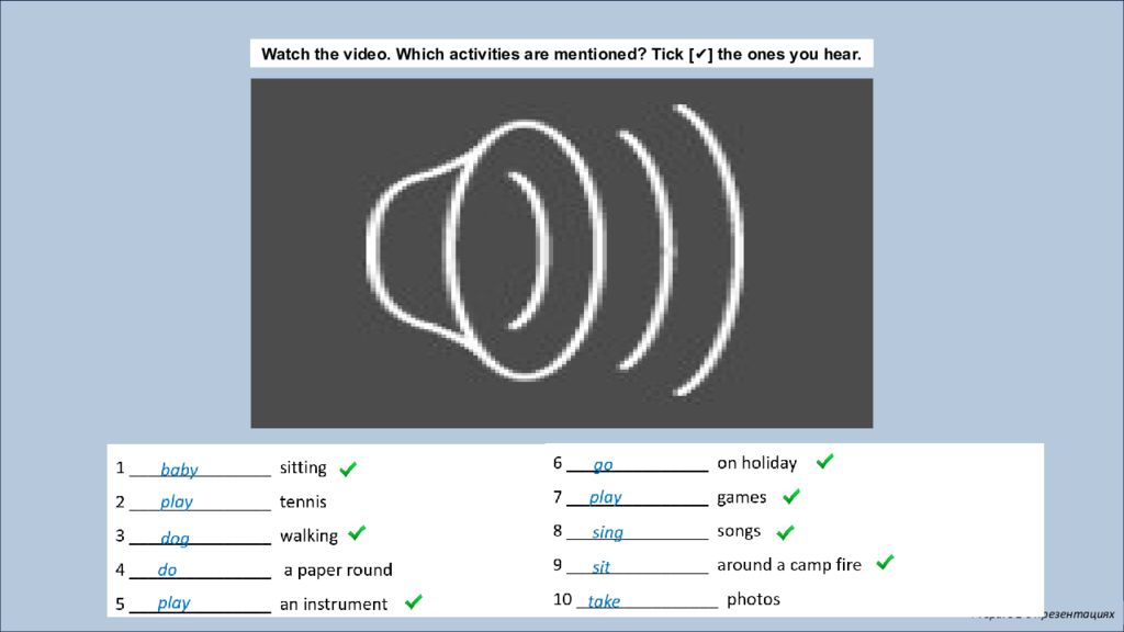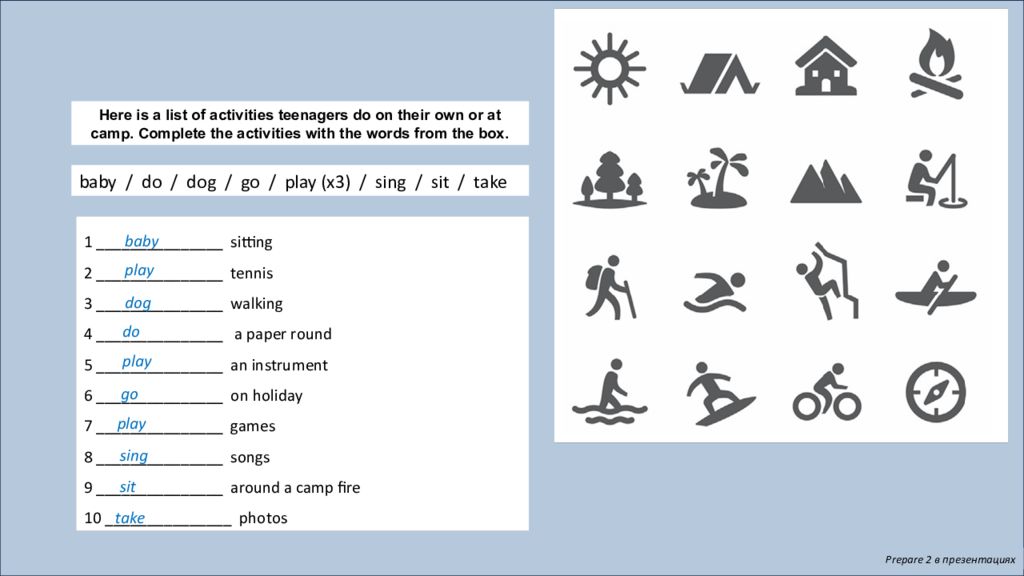 Prepare 2 в презентациях Here is a list of activities teenagers do on their own or at camp. Complete the activities with the words from the box. 1 _______________ sitting 2 _______________ tennis 3 _______________ walking 4 _______________ a paper round 5 _______________ an instrument 6 _______________ on holiday 7 _______________ games 8 _______________ songs 9 _______________ around a camp fire 10 _______________ photos baby / do / dog / go / play (x3) / sing / sit / take baby play dog do play go play sing sit take