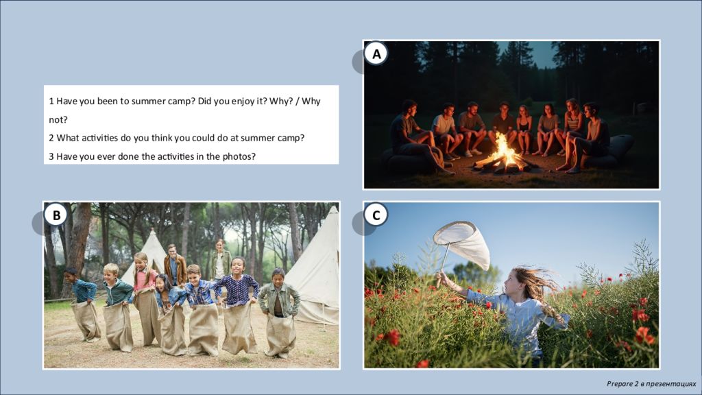 Prepare 2 в презентациях 1 Have you been to summer camp? Did you enjoy it? Why? / Why not? 2 What activities do you think you could do at summer camp? 3 Have you ever done the activities in the photos? B C A