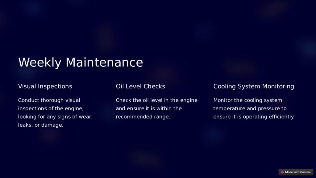 Weekly Maintenance Visual Inspections Conduct thorough visual inspections of the engine, looking for any signs of wear, leaks, or damage. Oil Level Checks Check the oil level in the engine and ensure it is within the recommended range. Cooling System Monitoring Monitor the cooling system temperature and pressure to ensure it is operating efficiently.