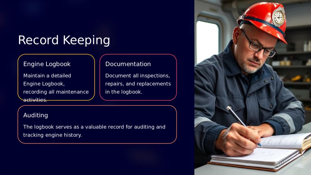 Record Keeping Engine Logbook Maintain a detailed Engine Logbook, recording all maintenance activities. Documentation Document all inspections, repairs, and replacements in the logbook. Auditing The logbook serves as a valuable record for auditing and tracking engine history.