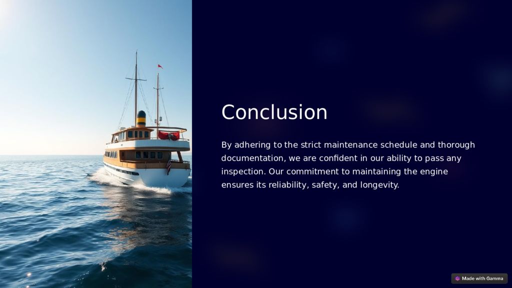 Conclusion By adhering to the strict maintenance schedule and thorough documentation, we are confident in our ability to pass any inspection. Our commitment to maintaining the engine ensures its reliability, safety, and longevity.