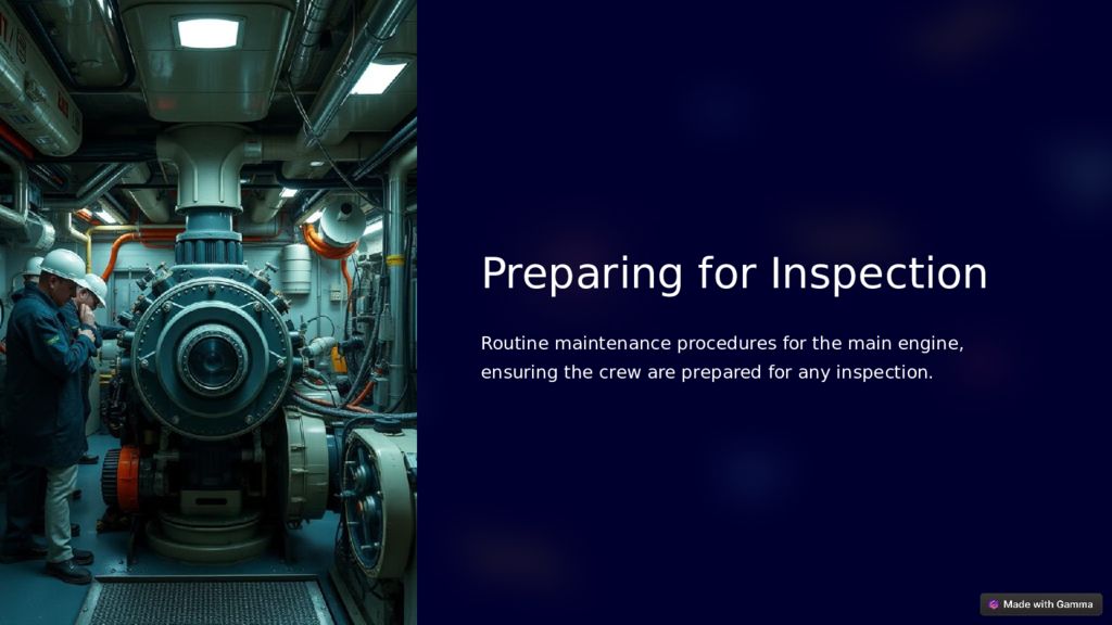Preparing for Inspection Routine maintenance procedures for the main engine, ensuring the crew are prepared for any inspection.