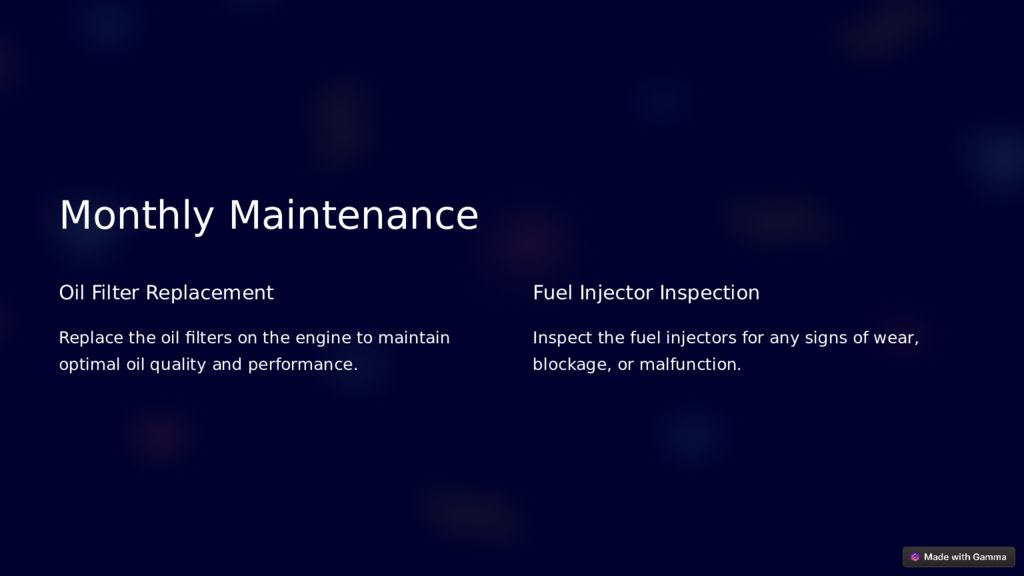 Monthly Maintenance Oil Filter Replacement Replace the oil filters on the engine to maintain optimal oil quality and performance. Fuel Injector Inspection Inspect the fuel injectors for any signs of wear, blockage, or malfunction.