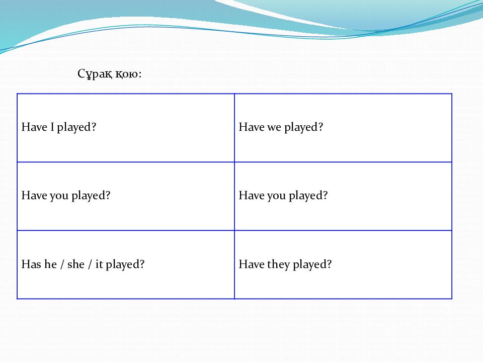 Сұрақ қою : Have I played? Have we played? Have you played? Have you played? Has he / she / it played? Have they played?