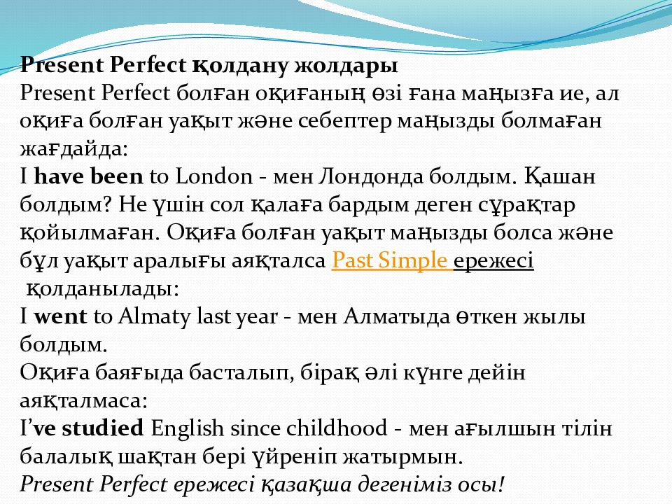 Present Perfect қолдану жолдары Present Perfect болған оқиғаның өзі ғана маңызға ие, ал оқиға болған уақыт және себептер маңызды болмаған жағдайда : I have been to London - мен Лондонда болдым. Қашан болдым ? Не үшін сол қалаға бардым деген сұрақтар қойылмаған. Оқиға болған уақыт маңызды болса және бұл уақыт аралығы аяқталса Past Simple ережесі қолданылады : I went to Almaty last year - мен Алматыда өткен жылы болдым. Оқиға баяғыда басталып, бірақ әлі күнге дейін аяқталмаса : I’ ve studied English since childhood - мен ағылшын тілін балалық шақтан бері үйреніп жатырмын. Present Perfect ережесі қазақша дегеніміз осы!