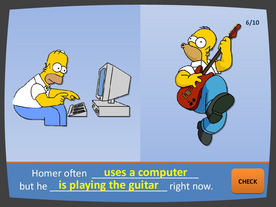 Homer often ____________________ but he ______________________ right now. uses a computer is playing the guitar NEXT CHECK 6/10