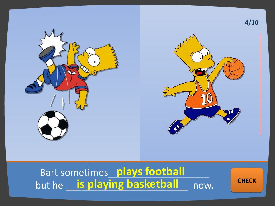 Bart sometimes ___________________ but he _______________________ now. plays football is playing basketball NEXT CHECK 4/10