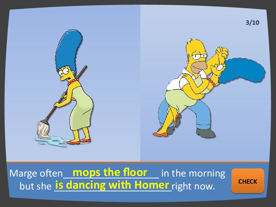 Marge often __________________ in the morning but she ______________________ right now. mops the floor is dancing with Homer NEXT CHECK 3/10