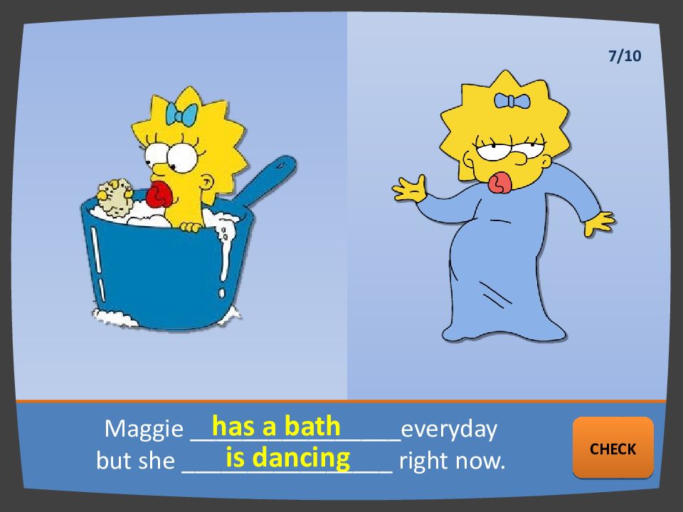 Maggie ________________ everyday but she ________________ right now. has a bath is dancing NEXT CHECK 7/10