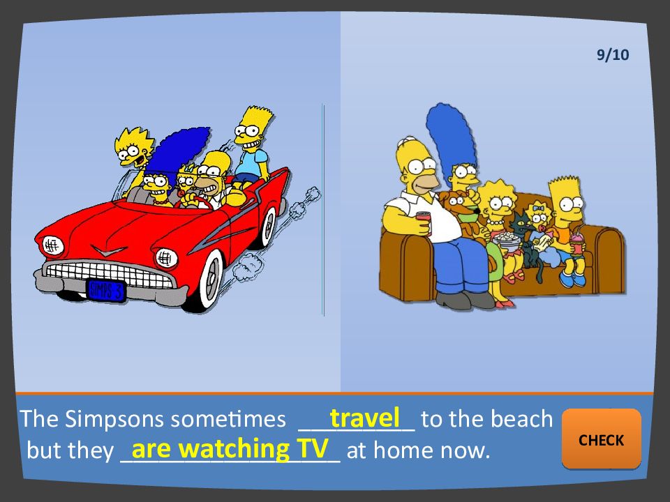 The Simpsons sometimes _________ to the beach but they _________________ at home now. travel are watching TV NEXT CHECK 9/10
