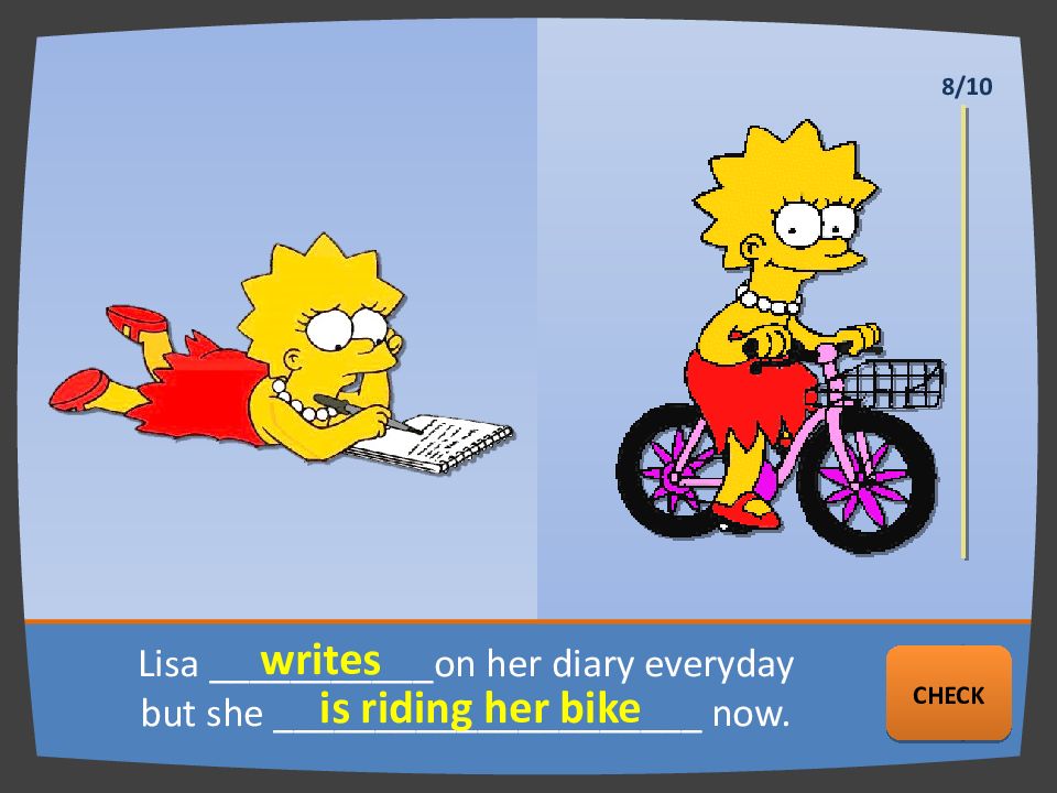 Lisa ___________ on her diary everyday but she _____________________ now. writes is riding her bike NEXT CHECK 8/10