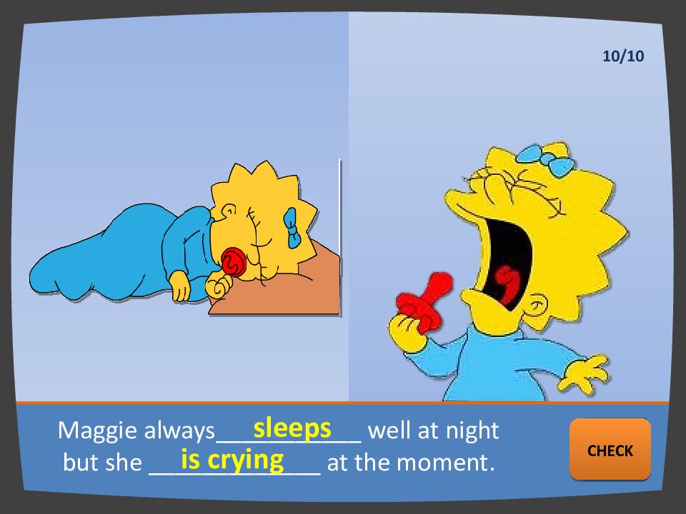 Homer sometimes __________ in the morning but he _______________________ now. sleeps is eating a doughnut NEXT CHECK 5/10