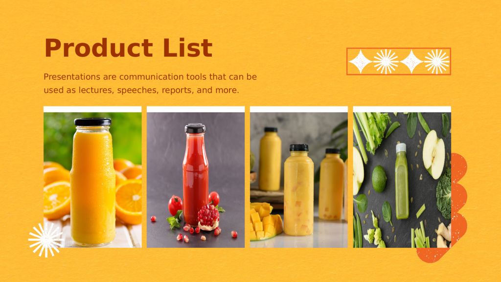 Product List Presentations are communication tools that can be used as lectures, speeches, reports, and more.