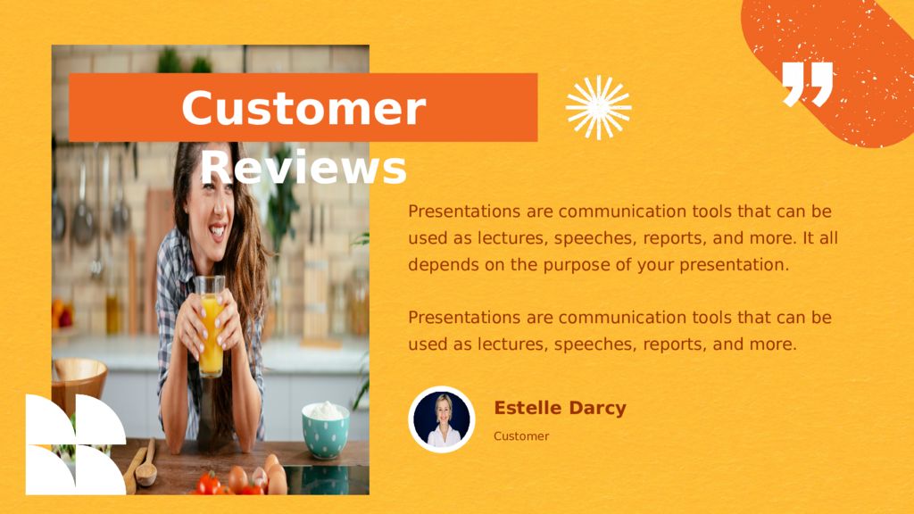Customer Reviews Presentations are communication tools that can be used as lectures, speeches, reports, and more. It all depends on the purpose of your presentation. Presentations are communication tools that can be used as lectures, speeches, reports, and more. Estelle Darcy Customer