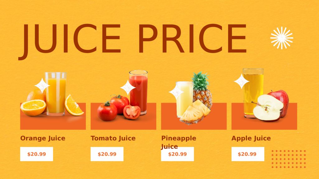 JUICE PRICE Orange Juice Tomato Juice Pineapple Juice Apple Juice $20.99 $20.99 $20.99 $20.99