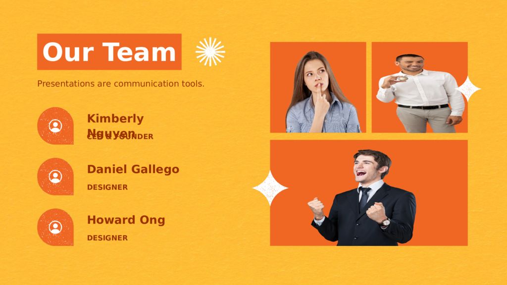 Our Team Presentations are communication tools. Kimberly Nguyen CEO & FOUNDER Daniel Gallego DESIGNER Howard Ong DESIGNER