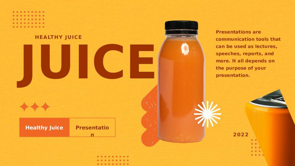 Presentations are communication tools that can be used as lectures, speeches, reports, and more. It all depends on the purpose of your presentation. Healthy Juice JUICE HEALTHY JUICE 2022 Presentation