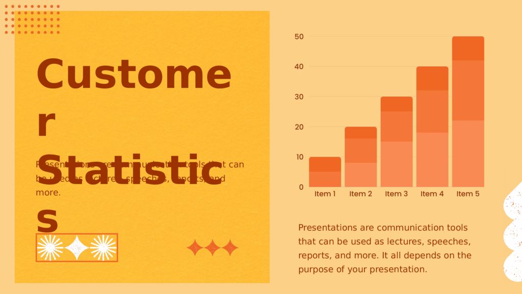 Customer Statistics Presentations are communication tools that can be used as lectures, speeches, reports, and more. It all depends on the purpose of your presentation. Presentations are communication tools that can be used as lectures, speeches, reports, and more.
