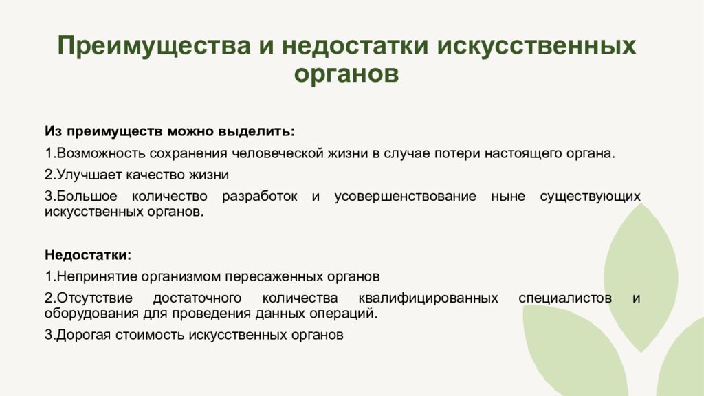 Из преимуществ можно выделить: 1.Возможность сохранения человеческой жизни в случае потери настоящего органа. 2.Улучшает качество жизни 3.Большое количество разработок и усовершенствование ныне существующих искусственных органов. Недостатки: 1.Непринятие организмом пересаженных органов 2.Отсутствие достаточного количества квалифицированных специалистов и оборудования для проведения данных операций. 3.Дорогая стоимость искусственных органов