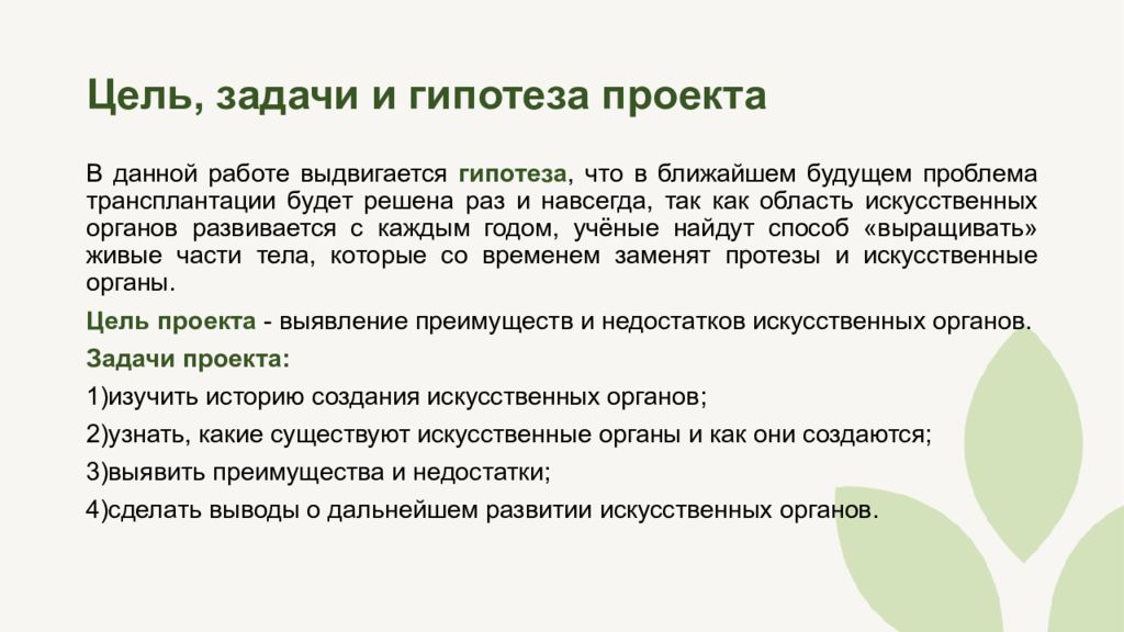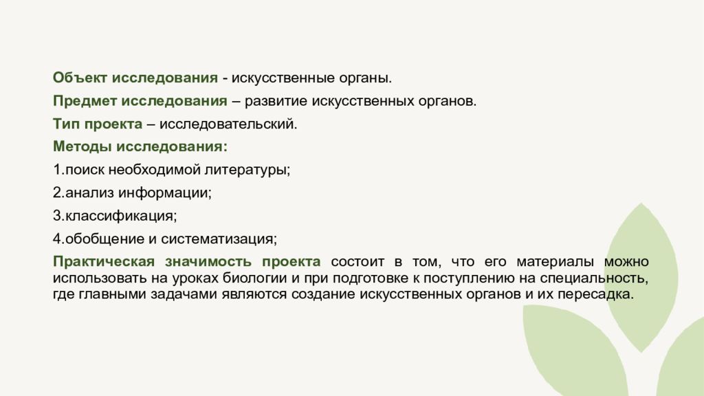 Объект исследования - искусственные органы. Предмет исследования – развитие искусственных органов. Тип проекта – исследовательский. Методы исследования: 1.поиск необходимой литературы; 2.анализ информации; 3.классификация; 4.обобщение и систематизация; Практическая значимость проекта состоит в том, что его материалы можно использовать на уроках биологии и при подготовке к поступлению на специальность, где главными задачами являются создание искусственных органов и их пересадка.