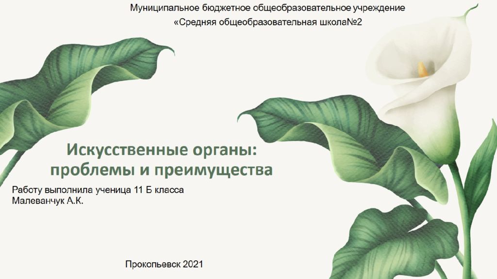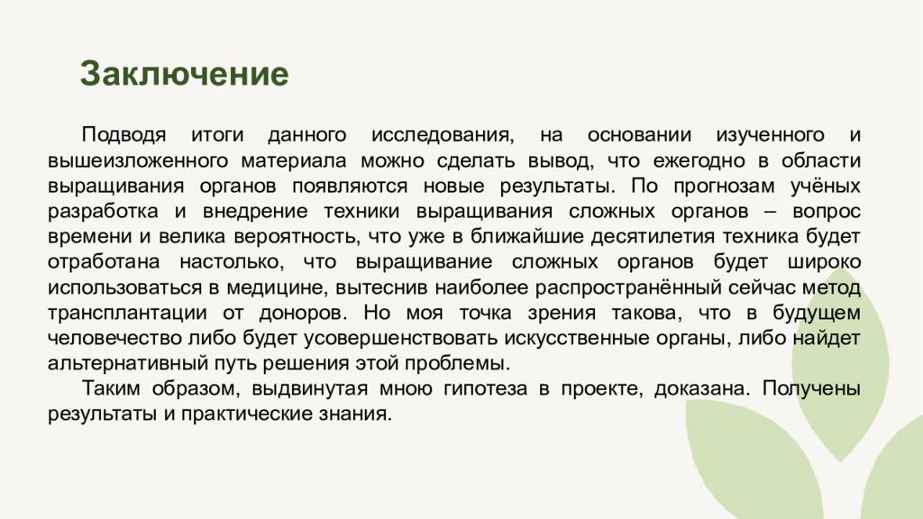 Заключение Подводя итоги данного исследования, на основании изученного и вышеизложенного материала можно сделать вывод, что ежегодно в области выращивания органов появляются новые результаты. По прогнозам учёных разработка и внедрение техники выращивания сложных органов – вопрос времени и велика вероятность, что уже в ближайшие десятилетия техника будет отработана настолько, что выращивание сложных органов будет широко использоваться в медицине, вытеснив наиболее распространённый сейчас метод трансплантации от доноров. Но моя точка зрения такова, что в будущем человечество либо будет усовершенствовать искусственные органы, либо найдет альтернативный путь решения этой проблемы. Таким образом, выдвинутая мною гипотеза в проекте, доказана. Получены результаты и практические знания.