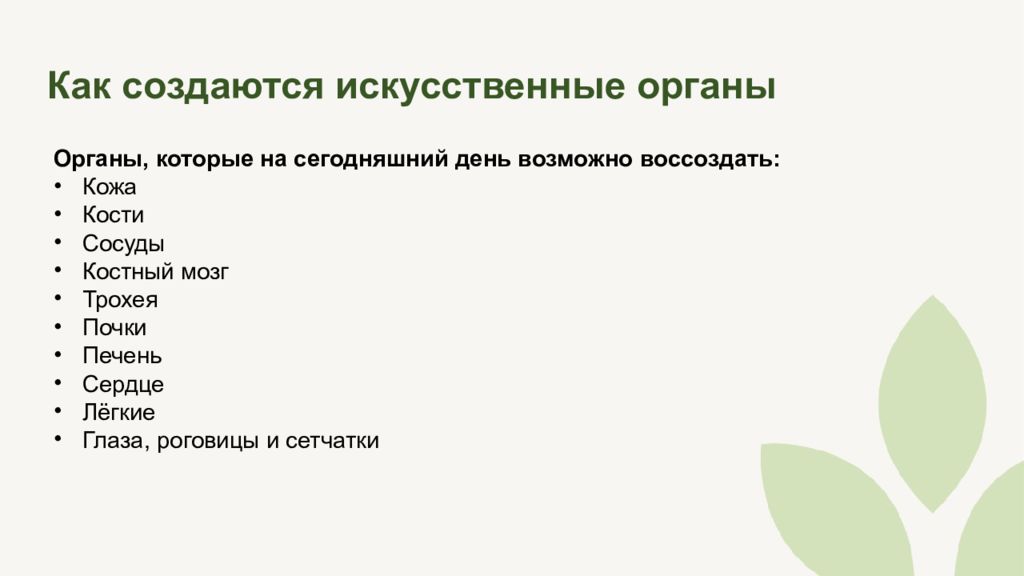 Как создаются искусственные органы Органы, которые на сегодняшний день возможно воссоздать: Кожа Кости Сосуды Костный мозг Трохея Почки Печень Сердце Лёгкие Глаза, роговицы и сетчатки