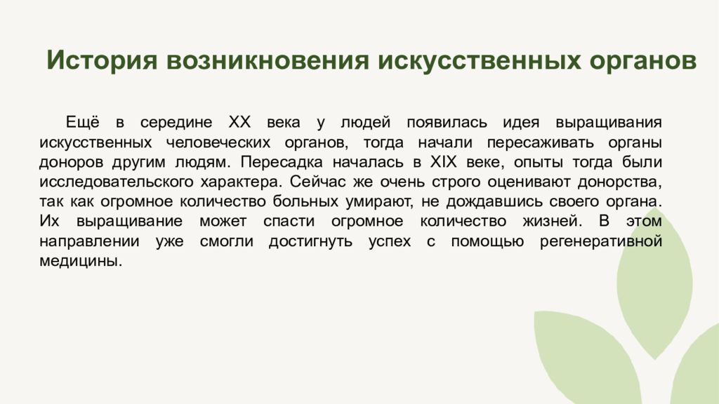История возникновения искусственных органов Ещё в середине XX века у людей появилась идея выращивания искусственных человеческих органов, тогда начали пересаживать органы доноров другим людям. Пересадка началась в XIX веке, опыты тогда были исследовательского характера. Сейчас же очень строго оценивают донорства, так как огромное количество больных умирают, не дождавшись своего органа. Их выращивание может спасти огромное количество жизней. В этом направлении уже смогли достигнуть успех с помощью регенеративной медицины.
