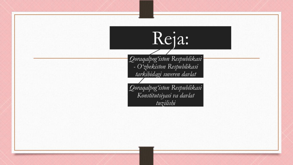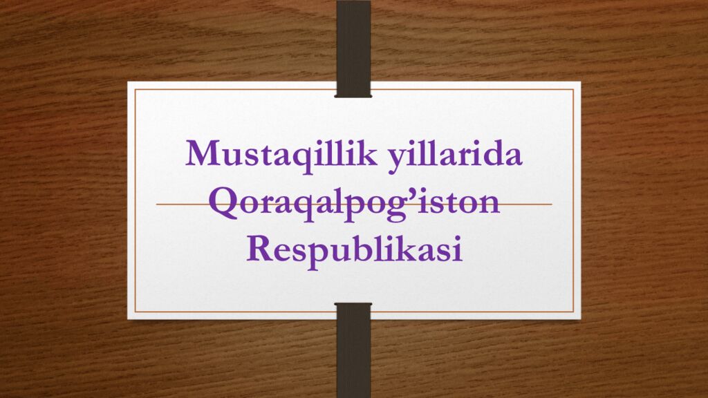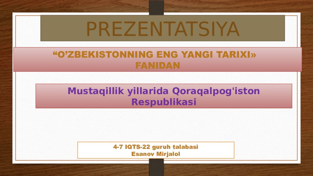 PREZENTATSIYA “O’ZBEKISTONNING ENG YANGI TARIXI » FANIDAN Mustaqillik yillarida Qoraqalpog'iston Respublikasi 4-7 IQTS-22 guruh talabasi Esanov Mirjalol