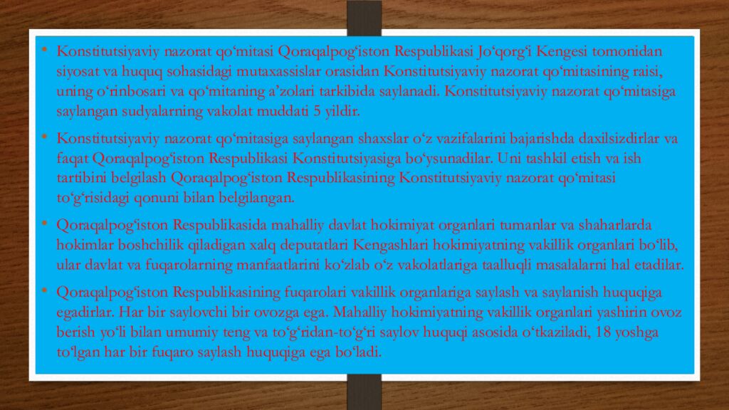 Konstitutsiyaviy nazorat qo‘mitasi Qoraqalpog‘iston Respublikasi Jo‘qorg‘i Kengesi tomonidan siyosat va huquq sohasidagi mutaxassislar orasidan Konstitutsiyaviy nazorat qo‘mitasining raisi, uning o‘rinbosari va qo‘mitaning a’zolari tarkibida saylanadi. Konstitutsiyaviy nazorat qo‘mitasiga saylangan sudyalarning vakolat muddati 5 yildir. Konstitutsiyaviy nazorat qo‘mitasiga saylangan shaxslar o‘z vazifalarini bajarishda daxilsizdirlar va faqat Qoraqalpog‘iston Respublikasi Konstitutsiyasiga bo‘ysunadilar. Uni tashkil etish va ish tartibini belgilash Qoraqalpog‘iston Respublikasining Konstitutsiyaviy nazorat qo‘mitasi to‘g‘risidagi qonuni bilan belgilangan. Qoraqalpog‘iston Respublikasida mahalliy davlat hokimiyat organlari tumanlar va shaharlarda hokimlar boshchilik qiladigan xalq deputatlari Kengashlari hokimiyatning vakillik organlari bo‘lib, ular davlat va fuqarolarning manfaatlarini ko‘zlab o‘z vakolatlariga taalluqli masalalarni hal etadilar. Qoraqalpog‘iston Respublikasining fuqarolari vakillik organlariga saylash va saylanish huquqiga egadirlar. Har bir saylovchi bir ovozga ega. Mahalliy hokimiyatning vakillik organlari yashirin ovoz berish yo‘li bilan umumiy teng va to‘g‘ridan-to‘g‘ri saylov huquqi asosida o‘tkaziladi, 18 yoshga to‘lgan har bir fuqaro saylash huquqiga ega bo‘ladi.