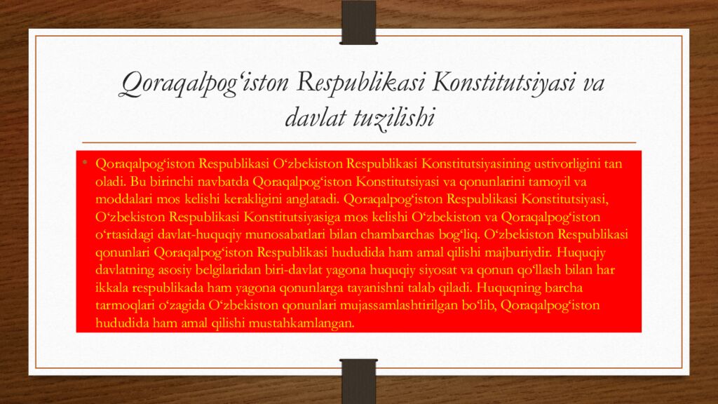 Qoraqalpog‘iston Respublikasi O‘zbekiston Respublikasi Konstitutsiyasining ustivorligini tan oladi. Bu birinchi navbatda Qoraqalpog‘iston Konstitutsiyasi va qonunlarini tamoyil va moddalari mos kelishi kerakligini anglatadi. Qoraqalpog‘iston Respublikasi Konstitutsiyasi, O‘zbekiston Respublikasi Konstitutsiyasiga mos kelishi O‘zbekiston va Qoraqalpog‘iston o‘rtasidagi davlat-huquqiy munosabatlari bilan chambarchas bog‘liq. O‘zbekiston Respublikasi qonunlari Qoraqalpog‘iston Respublikasi hududida ham amal qilishi majburiydir. Huquqiy davlatning asosiy belgilaridan biri-davlat yagona huquqiy siyosat va qonun qo‘llash bilan har ikkala respublikada ham yagona qonunlarga tayanishni talab qiladi. Huquqning barcha tarmoqlari o‘zagida O‘zbekiston qonunlari mujassamlashtirilgan bo‘lib, Qoraqalpog‘iston hududida ham amal qilishi mustahkamlangan.