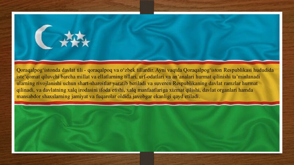 Qoraqalpog‘istonda davlat tili - qoraqalpoq va o‘zbek tillardir. Ayni vaqtda Qoraqalpog‘iston Respublikasi hududida iste’qomat qiluvchi barcha millat va ellatlarning tillari, urf-odatlari va an’analari hurmat qilinishi ta’minlanadi ularning rivojlanishi uchun shart-sharoitlar yaratib beriladi va suveren Respublikaning davlat ramzlar hurmat qilinadi, va davlatning xalq irodasini ifoda etishi, xalq manfaatlariga xizmat qilishi, davlat organlari hamda mansabdor shaxslarning jamiyat va fuqarolar oldida javobgar ekanligi qayd etiladi.
